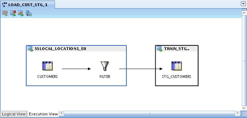 The second point to note is the Logical View and Execution View tabs at the bottom of the canvas. What we are working with now is the Logical View, and this looks just like the mapping canvas that you get with regular OWB mappings. When you switch to the Execution View though, this is the place where you start to make decisions about code templates, and what are called "Execution Units".