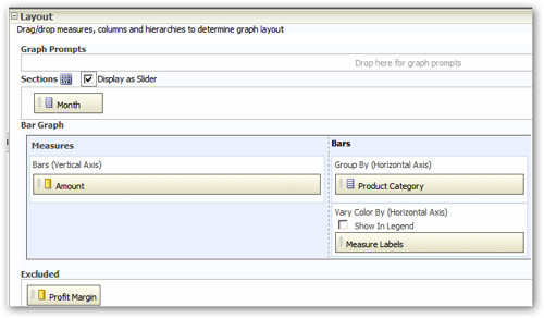 I create my bar chart and take a look at the controls for fine-tuning the view. Looking at the graph itself first of all, there's a new (SVG?) rendering engine replacing the old Flash-based engine used in 10g, which means that in theory it should work on iPads and iPhones as well. Best of all, the same graphing engine is shared with Oracle Fusion Middleware 11g (so you can create your own apps with the same look and feel as OBIEE 11g), and with BI Publisher 11g, so there's consistency between reports created with these two applications.