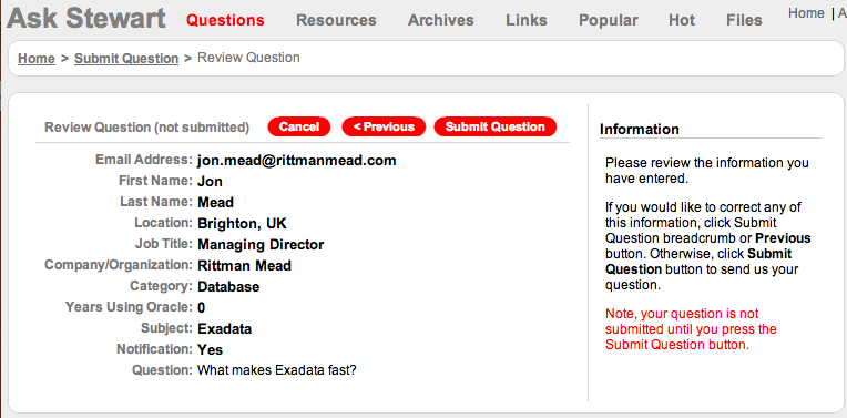 I'll be using another of the public domain Oracle APEX applications to describe some other techniques when the application schema isn't really normalized at all: the Ask the Expert application, which many of you will recognize as the application used to power the AskTom website. I couldn't resist putting "Ask Stewart" at the top: every Oracle Database junkie has dreamed of seeing their name at the top of that site.