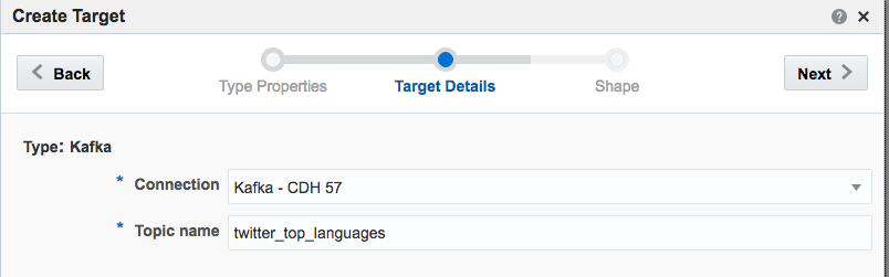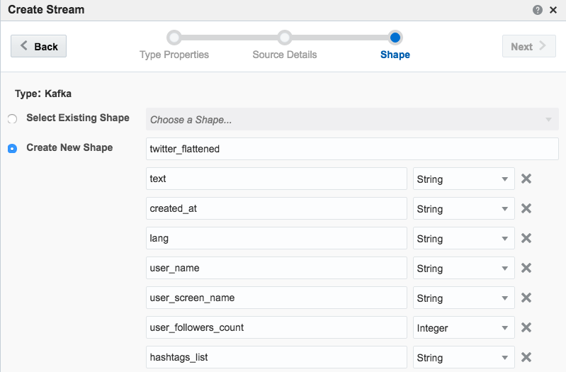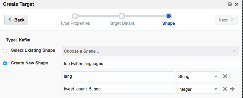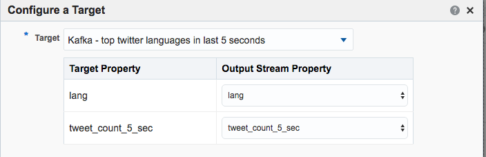 Note that I’ve defined a new Shape here based on the columns in the pattern. In the pattern itself I renamed the COUNT column to a clearer one (tweet_count_5_sec). Renaming it wasn’t strictly necessary since it’s possible to define the field/shape mapping when you configure the Target: