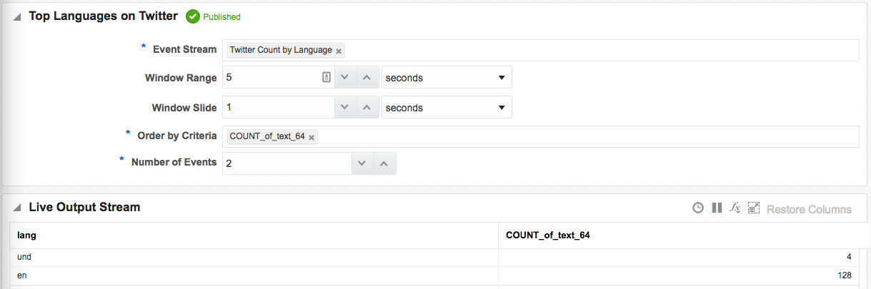 Taking the summarised stream (count of tweets, by language) I first Publish the exploration, making it available for use as the input to a subsequent exploration. Then from the Catalog page select a Pattern, which I’m going to use to build a stream showing the most common languages in the past five seconds. With the Top N pattern you specify the event stream (in this case, the summarised stream that I built above), and the metric by which to order the events which here is the count of tweets per language.