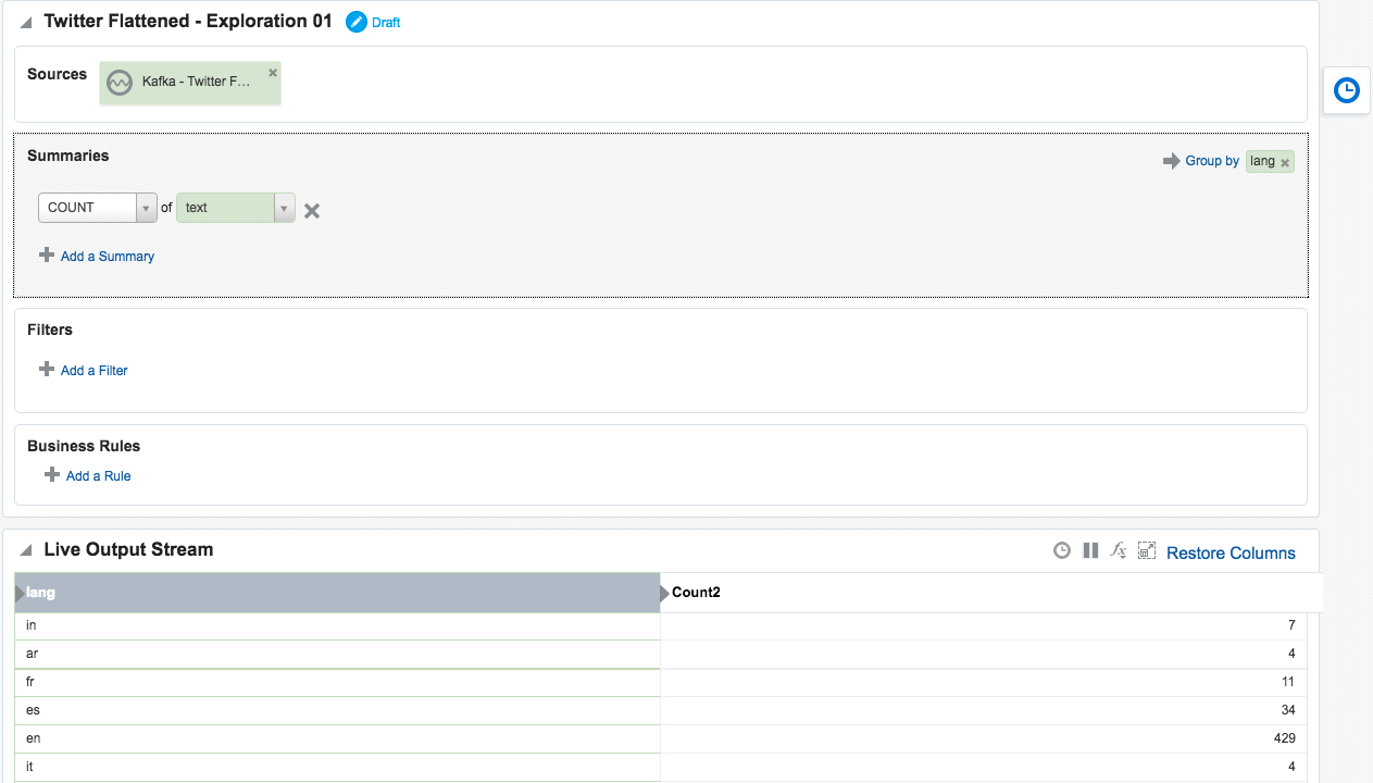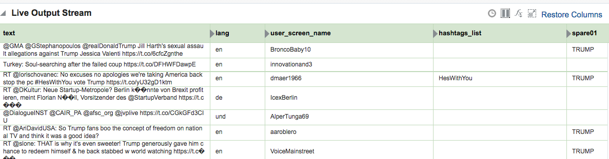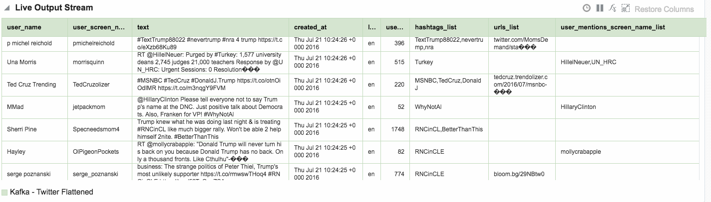 Using the flattened Twitter stream coming via Kafka that I demonstrated above, let’s now look at more OSA functionality.
