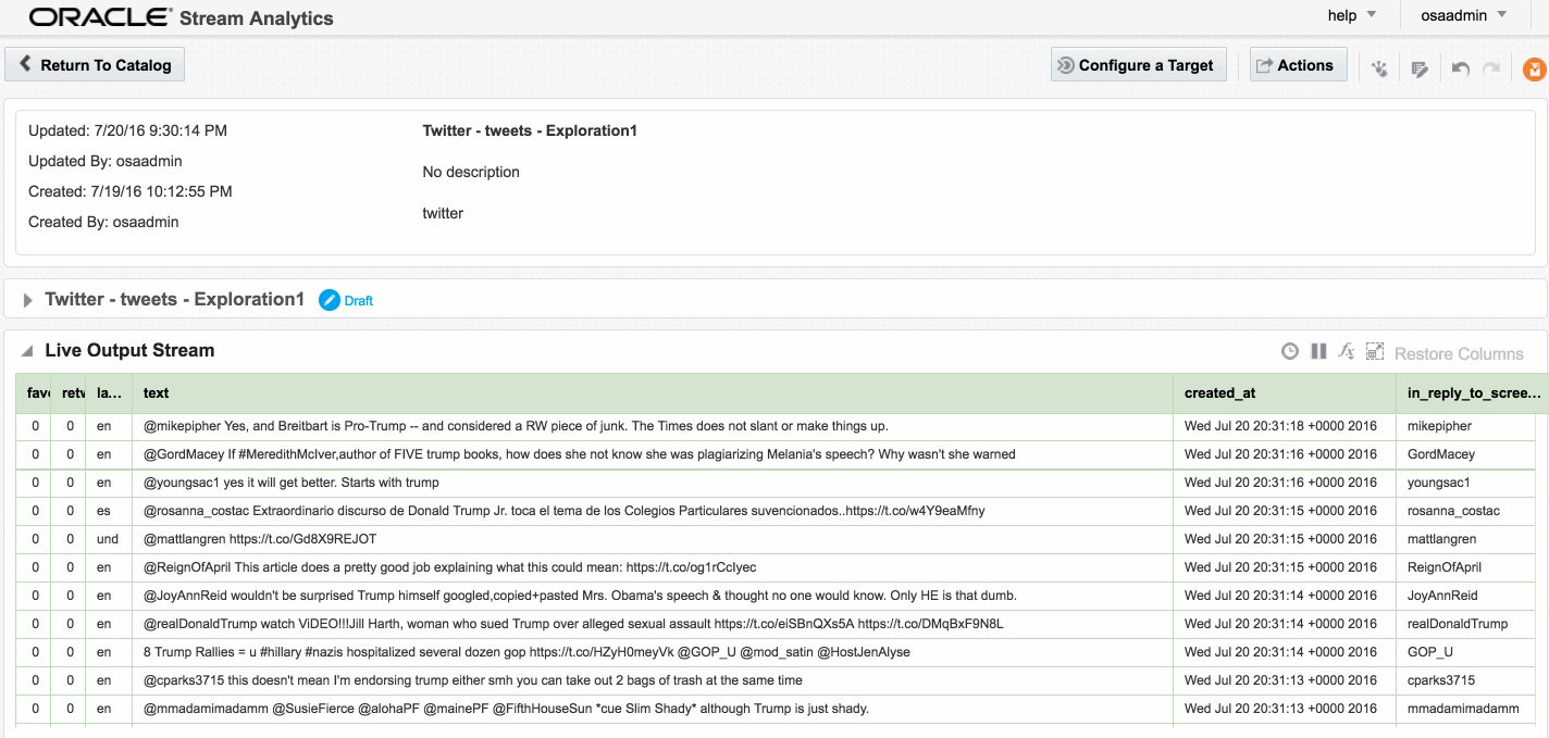 Assuming that the Stream is saved with no errors, you can then create an Exploration based on the stream and all being well, the live tweets are soon shown. Unlike the example at the top of this article, these tweets are coming in via Kafka, rather than the built-in OSA Twitter Stream. This is partly to demonstrate the Kafka capabilities, but also because the built-in OSA Twitter Stream only includes a subset of the available twitter data fields.