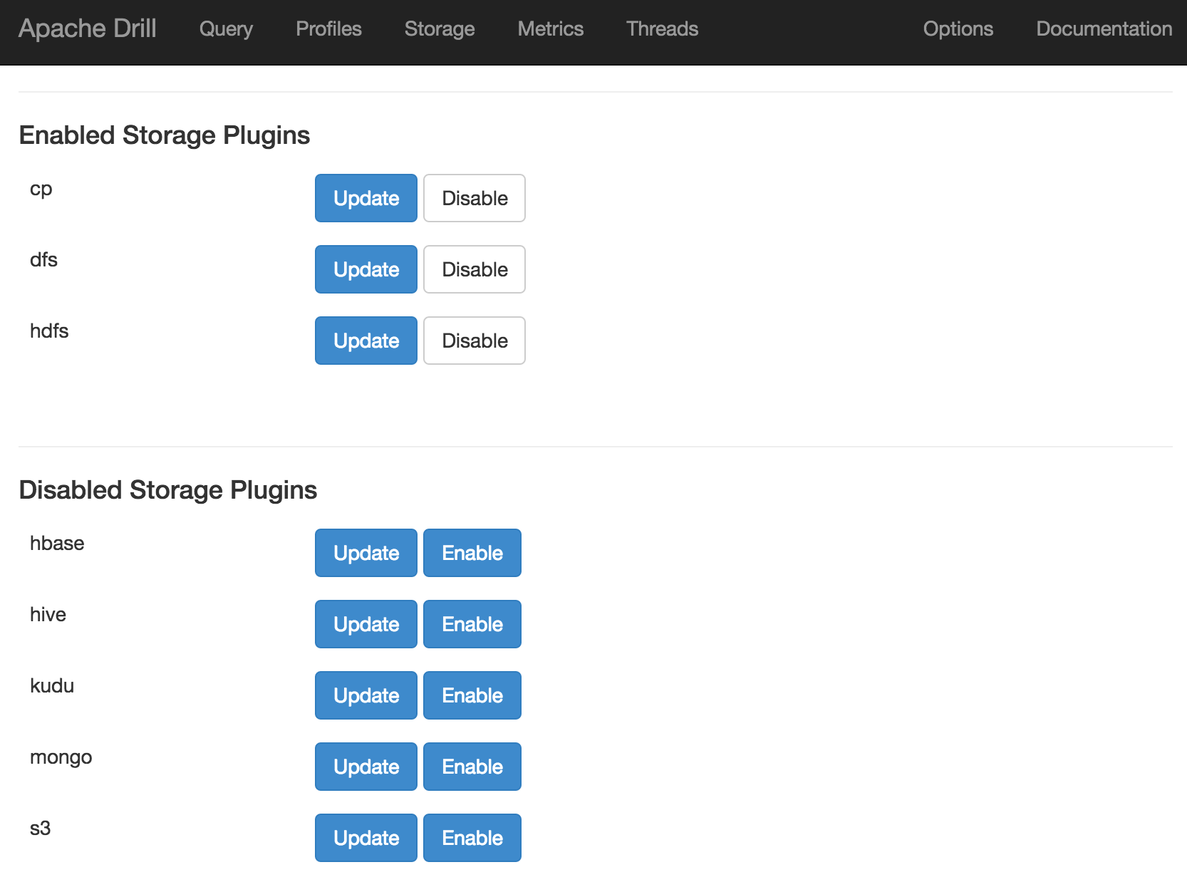 So far, so SQL, so relational - so familiar, really. Where Apache Drill starts to deviate from the obvious is its use of storage handlers. In the above query cp is the 'database' that we're running our query against, but this is in fact a "classpath" (hence "cp") storage handler that's defined by default. Within a 'database' there are 'schemas' which are sub-configurations of the storage handler. We'll have a look at viewing and defining these later on. For now, it's useful to know that you can also list out the available databases: