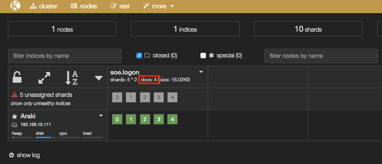 Finally, to see the number of documents on the corresponding Elasticsearch index:
