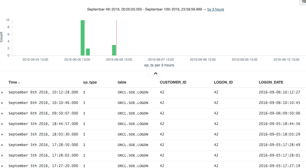 {"schema":{"type":"struct","fields":[{"type":"string","optional":false,"field":"table"},{"type":"string","optional":false,"field":"op_type"},{"type":"string","optional":false,"field":"op_ts"},{"type":"string","optional":false,"field":"current_ts"},{"type":"string","optional":false,"field":"pos"},{"type":"double","optional":true,"field":"LOGON_ID"},{"type":"double","optional":true,"field":"CUSTOMER_ID"},{"type":"string","optional":true,"field":"LOGON_DATE"}],"optional":false,"name":"ORCL.SOE.LOGON"},"payload":{"table":"ORCL.SOE.LOGON","op_type":"I","op_ts":"2016-09-02 14:56:26.000411","current_ts":"2016-09-02 15:56:34.111000","pos":"00000000000000002010","LOGON_ID":42.0,"CUSTOMER_ID":42.0,"LOGON_DATE":"2016-09-02:15:56:25"}}