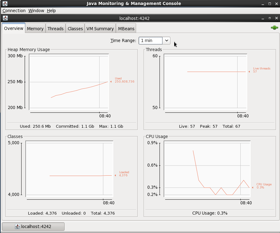 You'll need a GUI for jconsole, so either a desktop session on the server itself, X11 forwarded, or you can also run JConsole from a local machine (it's bundled with any JDK) and connect to the remote JMX. In this example I simply connected to the VM's desktop and ran JConsole locally there. You launch it by running it from the shell prompt: