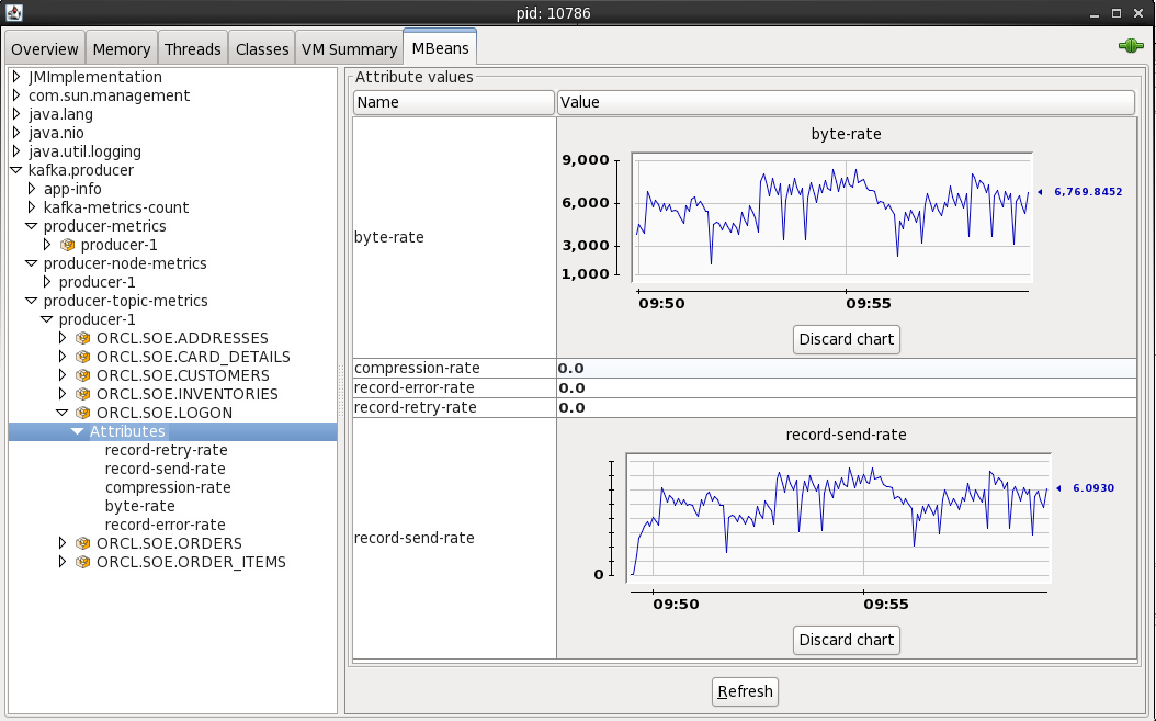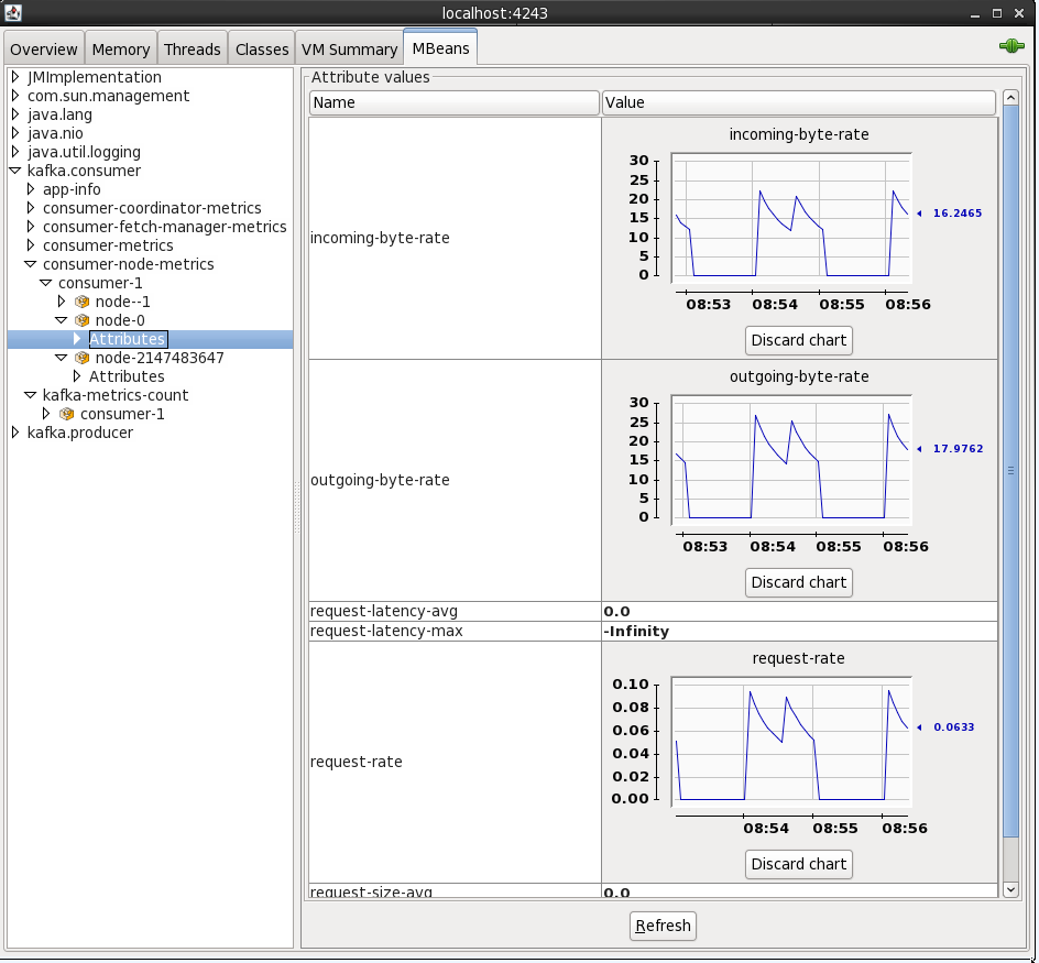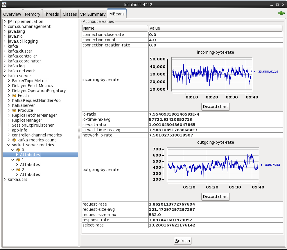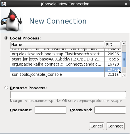 From here I connected to the 'Remote Process' on localhost:4242 to access the Kafka server process (because it's running as root the jconsole process (running as a non-root user) can't connect to it as a 'Local Process'). The port 4242 is what I specified as an environment variable as part of the kafka process launch.