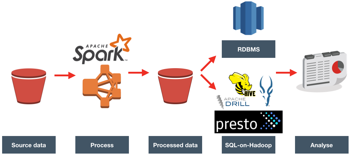 - With the data at rest on S3, Amazon's Athena is also of interest here, but was released after we carried out this particular investigation.