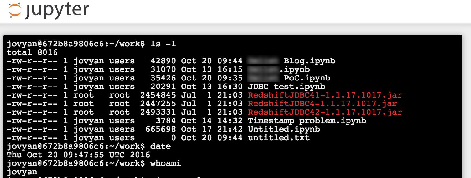Note that to install python libraries not present on the Docker image (such as boto, which is used for accessing AWS functionality from within Python) you can run from a Jupyter Terminal: