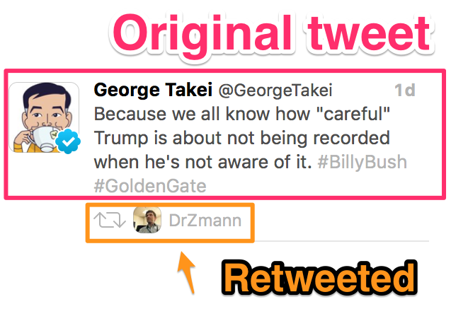 "text": "RT @GeorgeTakei: Because we all know how \"careful\" Trump is about not being recorded when he's not aware of it. #BillyBush #GoldenGate",