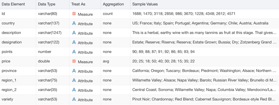 OAC does a similar job with the Metadata Overview where we can see for each column the name, type and sample values as well as the Attribute/Metric definition and associated aggregation than we can then change later on.