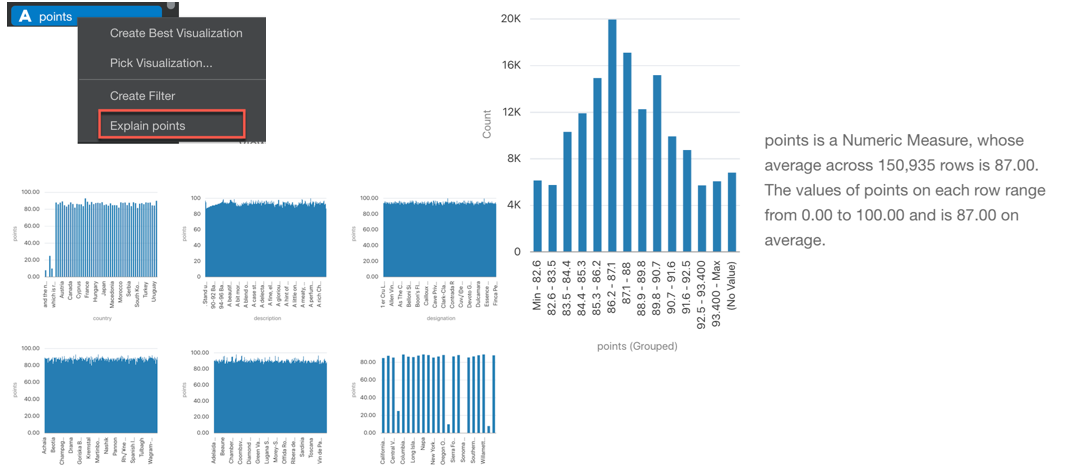 Analysing Data is always a complex task and is where the expert eye of a data scientist makes the difference. OAC, however, can help with the excellent Explain feature. As described in the previous post, by right clicking on any column in the dataset and selecting Explain, OAC will start calculating statistics and metrics related to the column and display the findings in graphs that we can incorporate in the Data Visualization project.