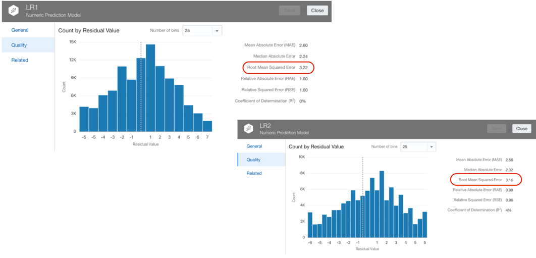After creating one or more Models, it's time to evaluate them, on OAC we can select a Model and Click on Inspect. In the Overview tab, Inspect shows the model description and properties. Far more interesting is the Quality tab which provides a set of Model scoring metrics based on the test dataset created following the Train Partition Percent parameter. In case of a Numeric Prediction problem, the Quality tab will show for each model quality metrics like the Root Mean Squared Error. OAC will provide similar metrics no matter which ML algorithm you're implementing, making the analysis and comparison easy.
