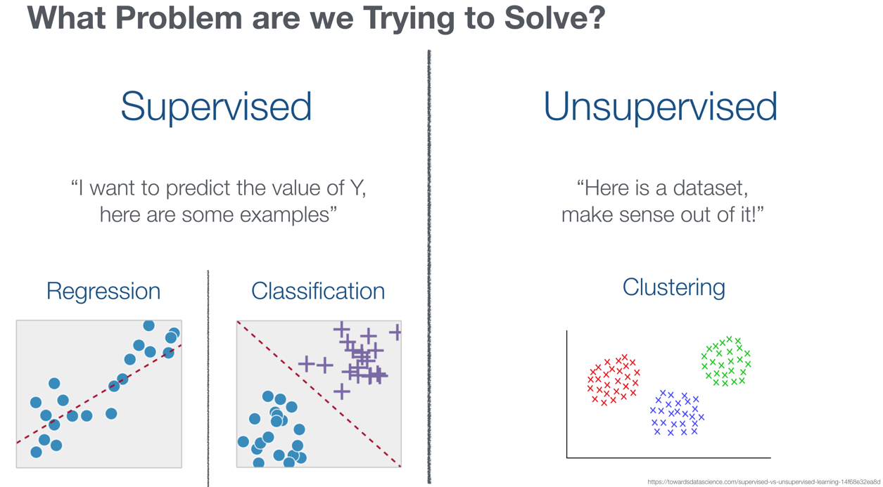 - Supervised when we have a history of the problem's solution and we want to predict future outcomes, we can then identify two subcategories