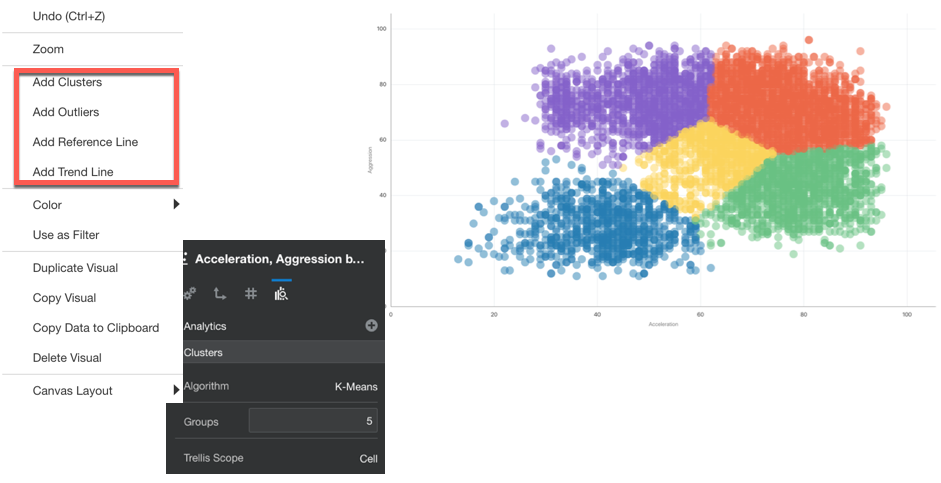 When adding one of the Analytics, we have some control over the behaviour of the predictive model. For the clustering image above we can decide which algorithm to implement (between K-means and Hierarchical Clustering), the number of clusters and the trellis scope in case we visualize multiple scatterplots, one for each value of a dimension.