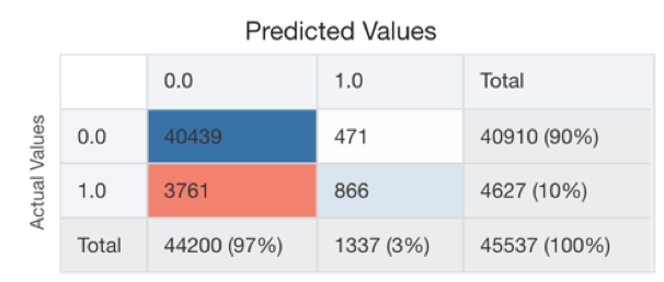 In the case of Classification, the Quality Tab will show the confusion matrix together with some pre-calculated metrics like Precision, Recall etc.