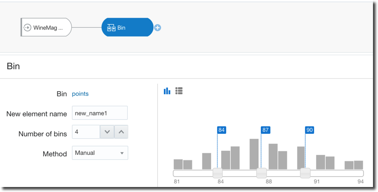 Oracle Analytics Cloud again covers all the above cases with two tools: Euclidean distance, generic data transformation like data condensation and binning are standard steps of the Dataflow component. We only need to set the correct parameters or write simple SQL-like statements. Moreover, for binning, there are options to do it manually as well as automatically providing equal-width and equal-height bins therefore taking out the manual labour and related BIAS.