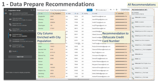 OAC again does a great job during the Data Preparation Recommendation step: after defining a data source, OAC will scan column names and values in order to find interesting features and propose some recommendations like geo-tagging, obfuscation, data splitting (e.g. Full Name split into First and Last Name) etc.
