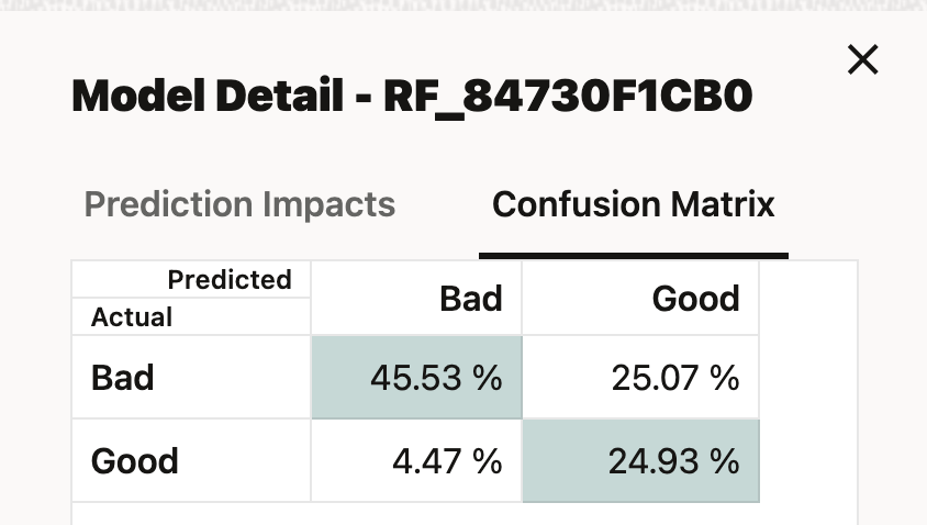 A confusion matrix is a summary of how the "predicted" values measure up against the "actual" values of your data. It allows you to easily visualise the number of correct and incorrect predictions, broken down by the class values (here, Good and Bad). The matrix shows you whether the model is "confusing" the two classes.