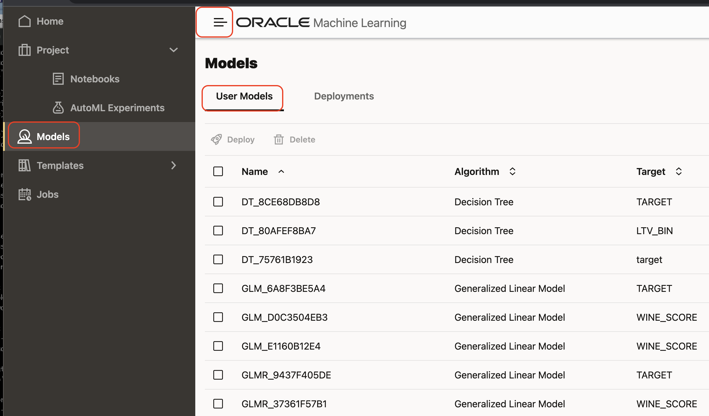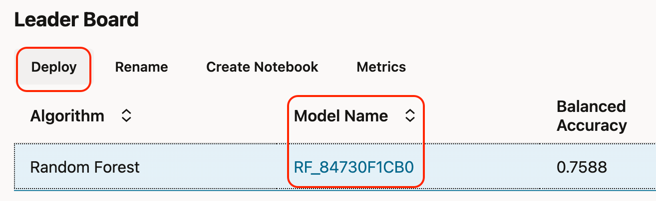 The AutoML UI also provides a quick and easy way to expose the model as a REST endpoint. Simply select the model and click on Deploy. This will create a RESTful endpoint, accessible from the ADW ORDS interface.