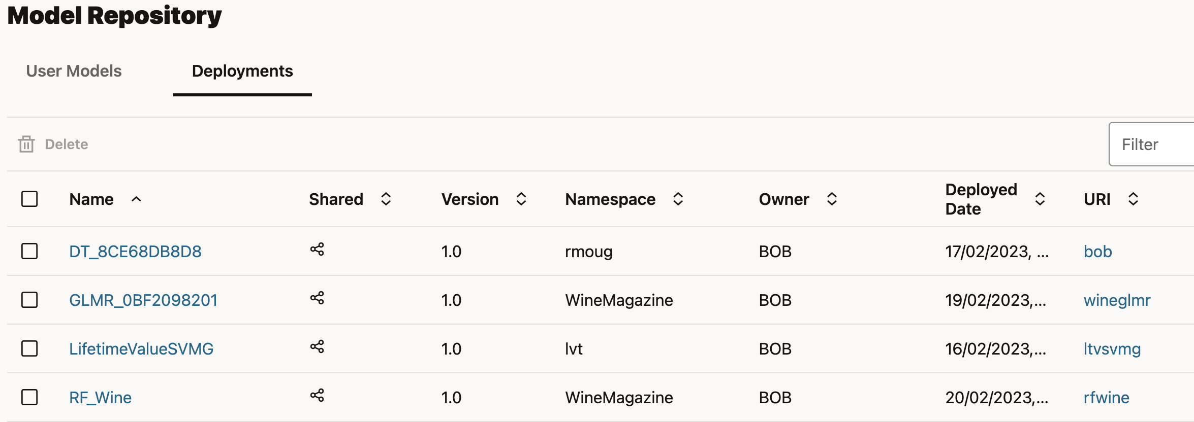 Every AutoML experiment run will save each trained model in to the ADW model catalog. These are represented as tables and views in your database schema and can be loaded in to any other Python or R notebooks and projects, using the ADS package.