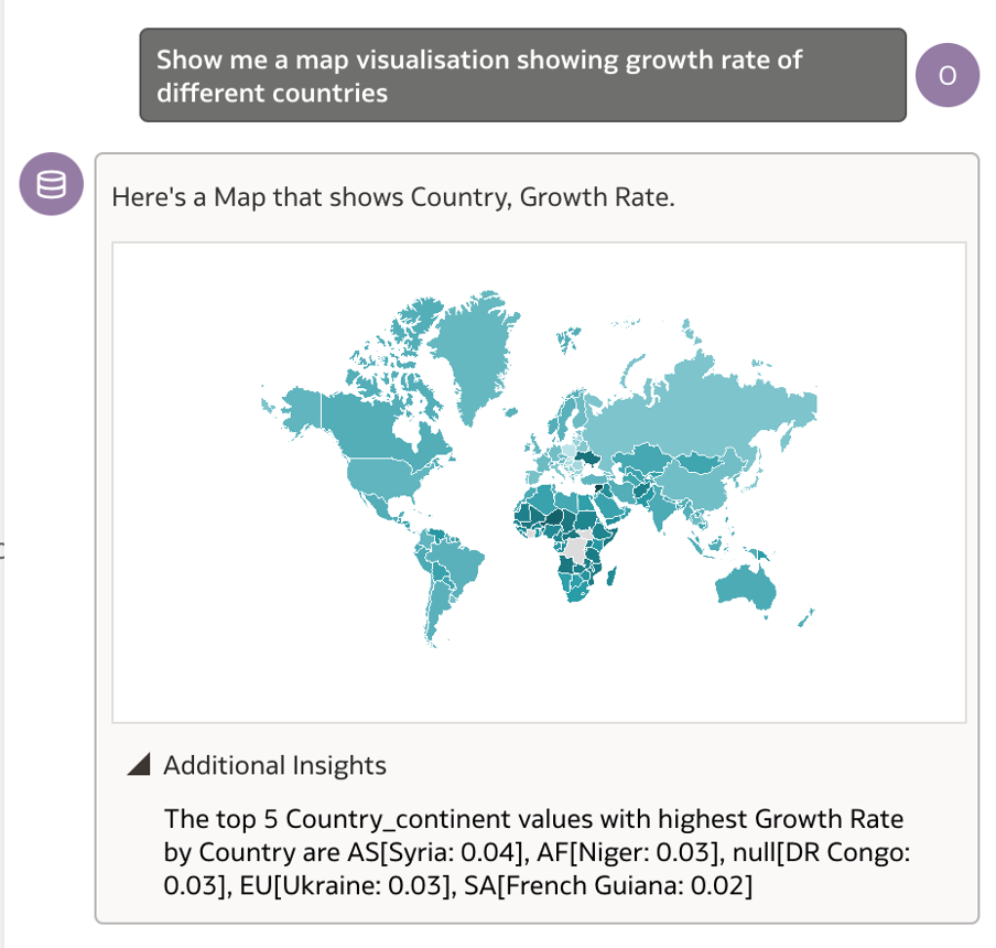 I also tried asking the question differently as ‘Show me a map visualisation showing growth rate of different countries’. This gave a clean map visualisation as shown below.