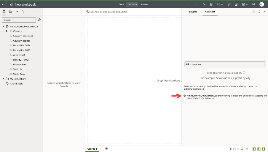 I have created a brand-new dataset in OAC, using the downloaded World Population data file and created a new workbook on top of it.