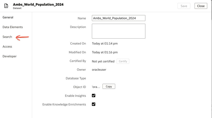 Right-click your dataset and select Inspect, to access the dataset inspector and click on the Search tab highlighted below.