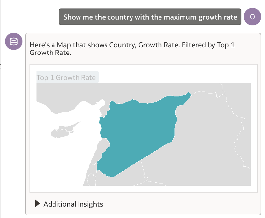 I now went ahead and asked a different question involving finding ‘the country with the maximum growth rate’. The result of this query was spot on and even more exciting to see was the map visualisation generated automatically.