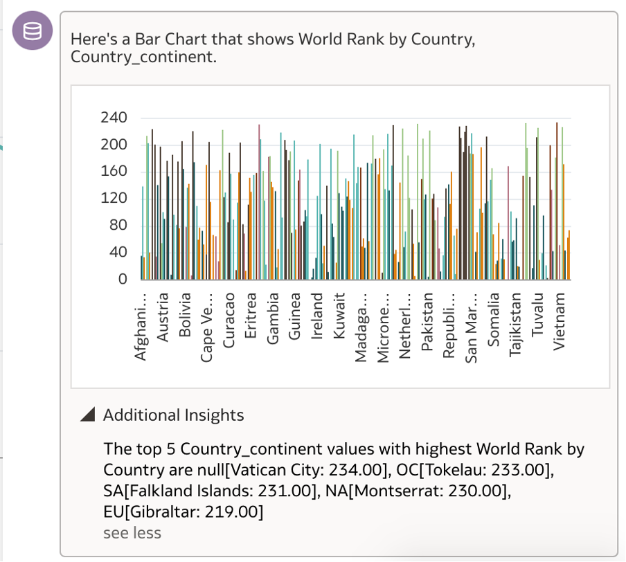 Dataset tells me that India is set with World Rank as 1 and the Vatican City has the rank as 234. Let us see how the assistant can decipher the information when we converse with it.