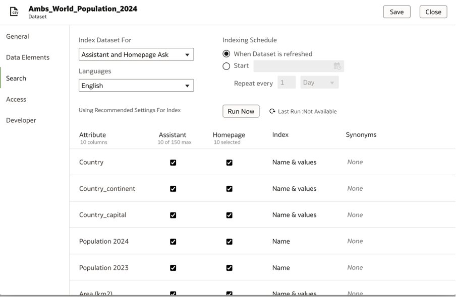 Population 2023 and Population 2024 are two columns in the dataset that are currently mapped as a Measure. If you look at the indexing settings for these fields, you will notice that the Index option for it only shows ‘Name’.