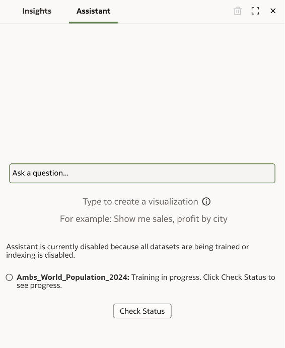 If indexing is not enabled on the dataset, you'll see a notification in the Assistant tab stating: 'Assistant is currently disabled because all datasets are being trained or indexing is disabled.'