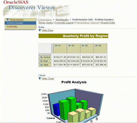 Discoverer Viewer is a useful complement to Discoverer Plus, and in many cases, clients roll out Discoverer Viewer to the majority of their users, with a handful of 'power users' using Discoverer Plus to create reports and graphs for the other users. Like Discoverer Plus, Discoverer Viewer reports are directly connected to the Oracle database using a stateful session, and any changes to the underlying data are dynamically reflected in the report or graph. The Discoverer Viewer interface can be customised for an organisation using preference files on the 9iAS server, and the look and feel can be completely altered to match an organisation's intranet style.