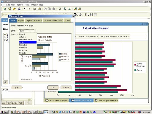 Workbooks created against the OLAP Catalog also benefit from improved graphing capabilities, allowing you to select styles and make more fine-tuned adjustments to the layout of graphs.