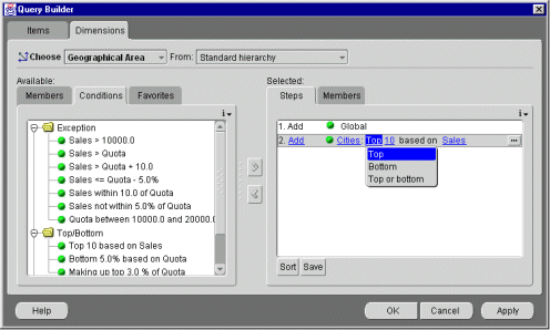 One of the key features of the BI Beans query bean is that queries are built up in several stages using normal English terms, allowing you choose a dimension and progressively limit down those members that will form part of the query. This type of query building interface (known to Oracle Express users as the 'Selector') is much more intuitive and flexible than the pure-SQL generating worksheet editor in older versions of Discoverer, allowing you to select dimension members based on values in the fact table ('limit products down to those products who's sales were in the top ten last year') all the while showing you the resulting list of members as defined by your query.