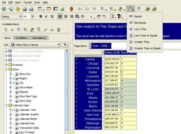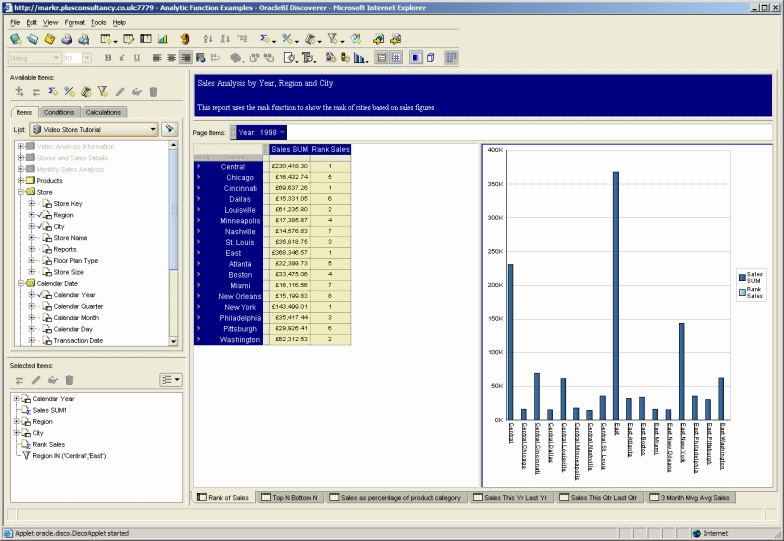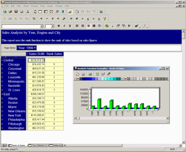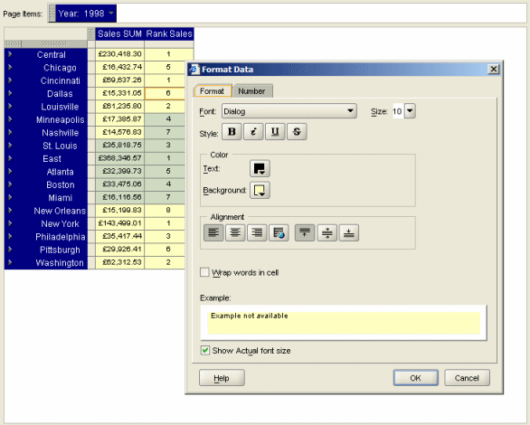 Lastly, and these are not things that are even present in Discoverer Desktop, but are found in competiting BI tools, it would be nice if you could select columns or rows and "freeze" these panes, like you can with Microsoft Excel, and it would be useful if the format of a particular cell could be based on the value of another cell (as you get with Express), so that for example the colour of a sales total cell could be red, green or amber depending on another cell that contained the performance to target.