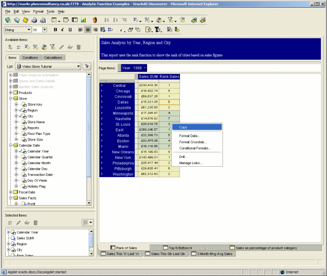 The big, big improvement with Discoverer Plus 10.1.2 is that the method of displaying cells has been overhauled. Instead of an HTML table, there's a java applet widget in it's place and it supports individual cell selection, selection of rows and columns, and right-clicking on cells and ranges of cells. This new ability to individually select cells addresses a major part of any issue with previous versions of Discoverer Plus.