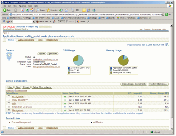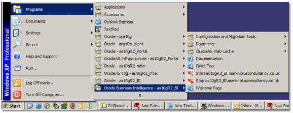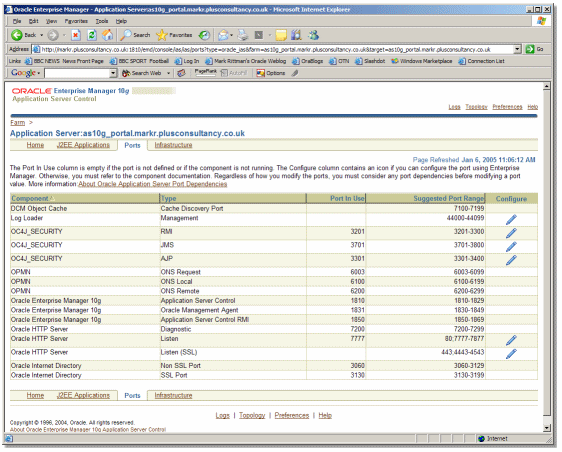 The Portal install goes through as with earlier releases without any problems (although a warning comes up that this mid-tier isn't supported on Windows XP). One issue that did crop up during the setup of the Portal install was that it wasn't immediately obvious which port number my OID instance was running on - the two numbers (SSL and Non-SSL) suggested in the online help didn't work and in the end I had to log on to the EM Website for the infrastructure instance and retrieve the OID port number from there (which isn't the end of the world, but everything so far had been so easy)