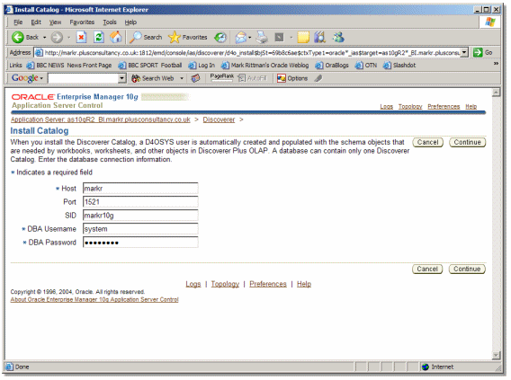 So now it was time to test out Discoverer Drake. The first thing you need to do with Drake (if you're going to use the OLAP Option) is to fire up Enterprise Manager, install the Discoverer Catalog, and authorise the schemas that will contain data that Discoverer will analyze.