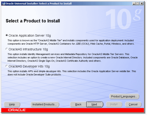 Now the infrastructure has been installed, the next step is to install the Portal and Wireless mid-tier, which you do by running the installer on Disk1 again, and this time select the Oracle Application Server 10g option.