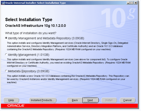What we're being given here is the choice of installing the infrastructure database together with OID, just OID or just the infrastructure database. I selected the first option (to install both at the same time) and went on to the next stage of the install.