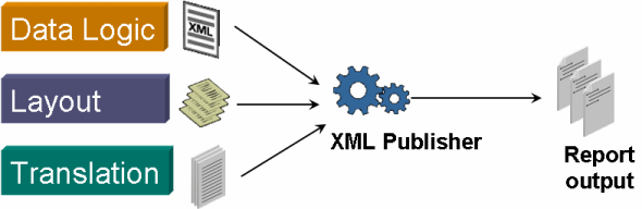 XML Publisher breaks the three components apart and treats them separately at design time, at runtime the three are brought back together by XML Publisher to generate the final formatted, translated output. There is an immediate gain in that this model is far more flexible i.e. a single data definition can support multiple layouts, multiple translations can be applied at runtime to generate translated output. This leads to a reduction in maintenance costs for all concerned.