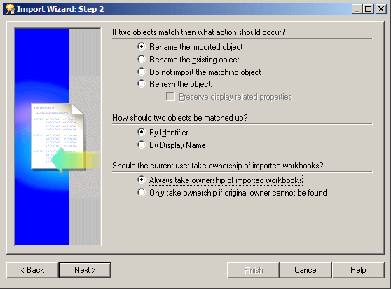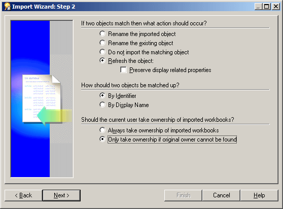 What this does then is use the contents of the .eex file to refresh existing folders (and their items) if they exist already, and create new folders if they don't currently exist in the target EUL. It matches the folders by identifier, which in most cases should match up, and only changes ownership of the workbooks if the the original owner doesn't have an account on the target database. The only change I'd make to Michael's approach is to uncheck the "Preserve display related properties" checkbox as otherwise any changes you've made to object names (folders, items etc) won't be brought through when you refresh the business areas.