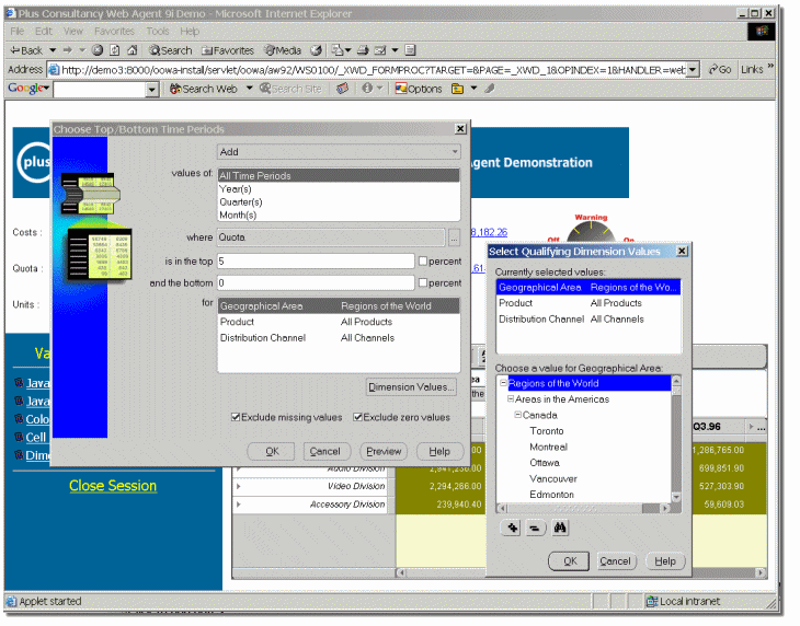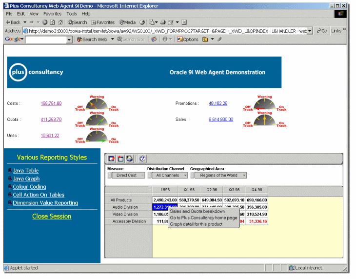 Note the java applet in the bottom right-hand corner, and the top half of the screen, that shows how a completely custom interface can be built up just by having your OLAP DML code output HTML