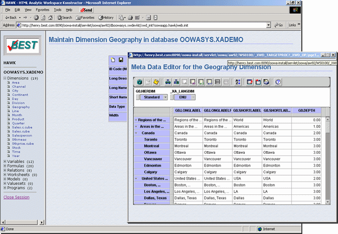 Also, a quick trivia note : Rod LeDieu's BestHQ Software (who are no longer trading) produced a 9i OLAP Web Agent-based application for creating and loading analytic workspaces, called HAWK (HTML Analytic Workspace Konstructor), a screenshot of which is displayed below:
