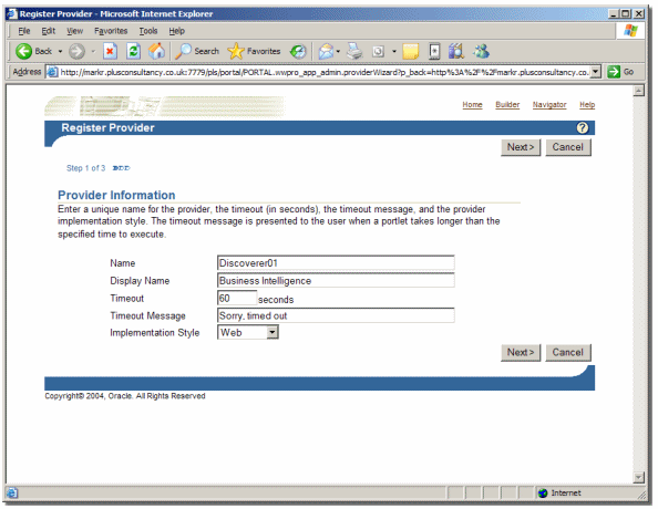 Log in to Portal, and click on the administrator tab, then the portlets sub-tab. Click on the "Register a Provider" link, then enter "Discoverer01" as the name (or any other unique provider name you choose), "Business Intelligence" as the display name, provide a timeout limit and message, and select "Web" as the implementation style.