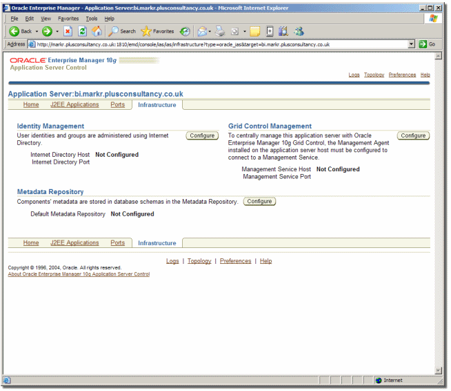 The first step then is to make sure you've got all three tiers - Infrastructure, Portal and Business Intelligence, up and running, and ensure that you can connect to the Infrastructure and Business Intelligence Enterprise Manager websites. In my case, the relevant URLs were: