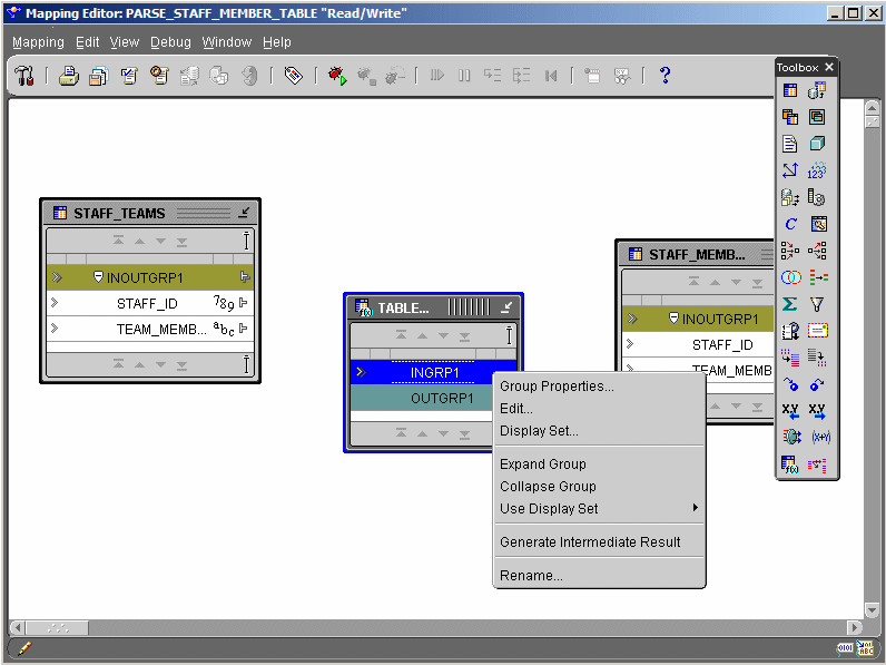 Good stuff. The next step is to create an OWB target module, import in the two tables (but not the function we've just created), then create a mapping. Drop on the source and target tables, and then a table function operator from the mapping toolbox. Right-click on the table function's INGRP1 group ...
