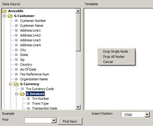Whilst this is certainly simpler to set up than repeating rows in Oracle Reports Builder, I think this bit could do with a bit of tidying up - when you drag the Invoices folder over to the Template pane, you get presented with the options "Drop Single Node / Drop All Nodes / Cancel" which might make sense to an XML programmer but I think would sound a bit strange to a business user just putting a report together.